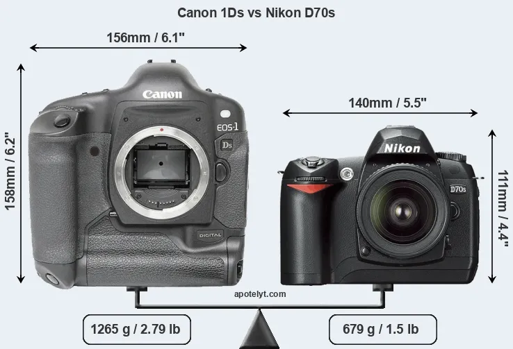 An illustration of the physical size and weight of the Canon 1Ds and the Nikon D70s is provided in the side-by-side display below. The two cameras are presented according to their relative size. Three consecutive views from the front, the top, and the rear side are shown. All width, height and depth dimensions are rounded to the nearest millimeter.