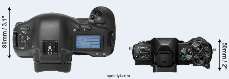 The side-by-side display below illustrates the physical size and weight of the Canon 1Ds and the Olympus E-M10 III. The two cameras are presented according to their relative size. Three successive views from the front, the top, and the rear are shown. All size dimensions are rounded to the nearest millimeter.