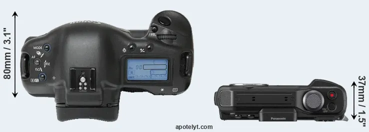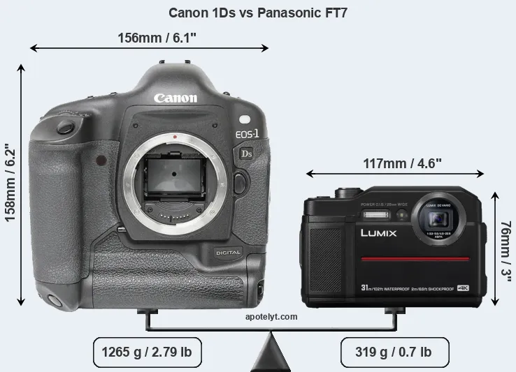 The physical size and weight of the Canon 1Ds and the Panasonic FT7 are illustrated in the side-by-side display below. The two cameras are presented according to their relative size. Three consecutive perspectives from the front, the top, and the back are available. All width, height and depth dimensions are rounded to the nearest millimeter.