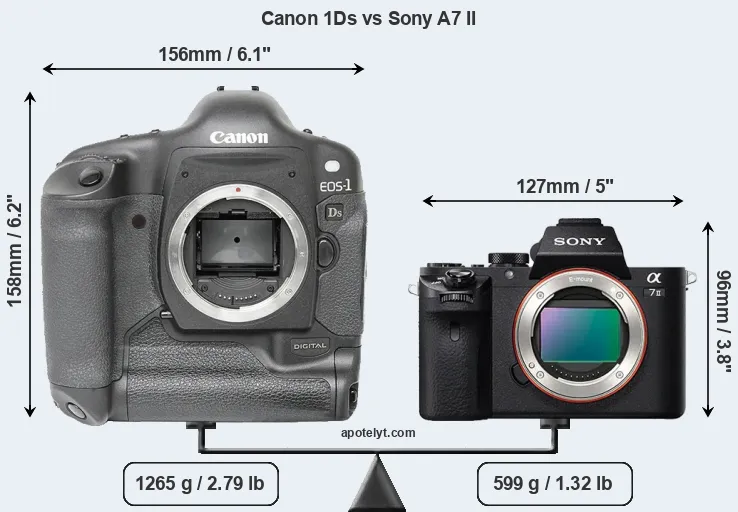 An illustration of the physical size and weight of the Canon 1Ds and the Sony A7 II is provided in the side-by-side display below. The two cameras are presented according to their relative size. Three successive views from the front, the top, and the rear are shown. All width, height and depth measures are rounded to the nearest millimeter.