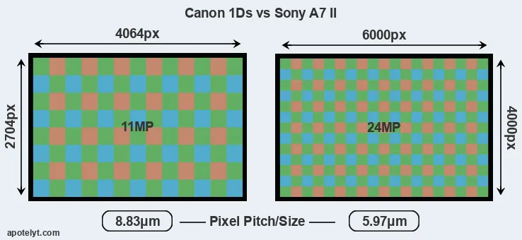 Despite having a slightly smaller sensor, the A7 II offers a higher resolution of 24 megapixels, compared with 11 MP of the 1Ds. This megapixels advantage comes at the cost of a higher pixel density and a smaller size of the individual pixel (with a pixel pitch of 5.97μm versus 8.83μm for the 1Ds). However, it should be noted that the A7 II is much more recent (by 12 years and 1 month) than the 1Ds, and its sensor will have benefitted from technological advances during this time that make it possible to gather light more efficiently.