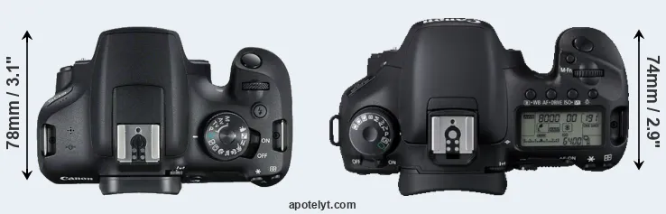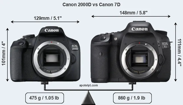An illustration of the physical size and weight of the Canon 2000D and the Canon 7D is provided in the side-by-side display below. The two cameras are presented according to their relative size. Three consecutive perspectives from the front, the top, and the back are available. All size dimensions are rounded to the nearest millimeter.