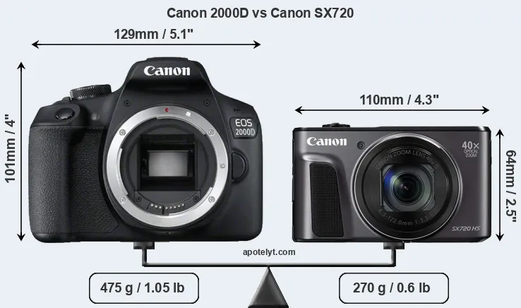 An illustration of the physical size and weight of the Canon 2000D and the Canon SX720 is provided in the side-by-side display below. The two cameras are presented according to their relative size. Three consecutive perspectives from the front, the top, and the back are available. All width, height and depth measures are rounded to the nearest millimeter.