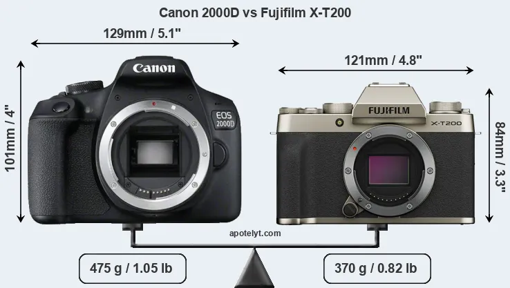 An illustration of the physical size and weight of the Canon 2000D and the Fujifilm X-T200 is provided in the side-by-side display below. The two cameras are presented according to their relative size. Three consecutive perspectives from the front, the top, and the back are available. All width, height and depth dimensions are rounded to the nearest millimeter.