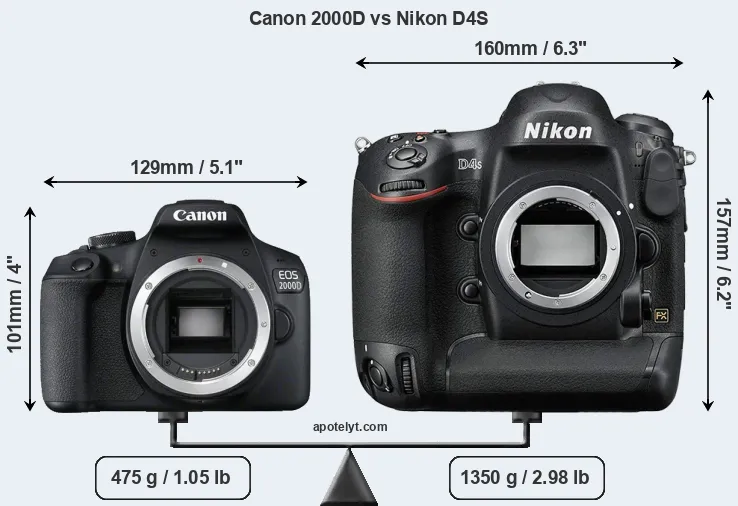The physical size and weight of the Canon 2000D and the Nikon D4S are illustrated in the side-by-side display below. The two cameras are presented according to their relative size. Three successive views from the front, the top, and the rear are shown. All width, height and depth measures are rounded to the nearest millimeter.