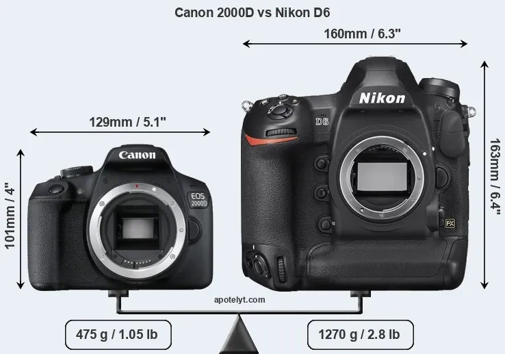 An illustration of the physical size and weight of the Canon 2000D and the Nikon D6 is provided in the side-by-side display below. The two cameras are presented according to their relative size. Three successive views from the front, the top, and the rear are shown. All width, height and depth measures are rounded to the nearest millimeter.