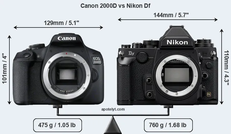If the front view area (width x height) of the cameras is taken as an aggregate measure of their size, the Nikon Df is notably larger (22 percent) than the Canon 2000D. Moreover, the Df is substantially heavier (60 percent) than the 2000D. It is noteworthy in this context that the Df is splash and dust-proof, while the 2000D does not feature any corresponding weather-sealing.