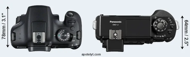 The side-by-side display below illustrates the physical size and weight of the Canon 2000D and the Panasonic L1. The two cameras are presented according to their relative size. Three successive views from the front, the top, and the rear are shown. All width, height and depth dimensions are rounded to the nearest millimeter.