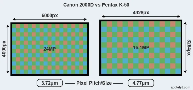 Despite having a smaller sensor, the Canon 2000D offers a higher resolution of 24 megapixels, compared with 16.1 MP of the Pentax K-50. This megapixels advantage comes at the cost of a higher pixel density and a smaller size of the individual pixel (with a pixel pitch of 3.72μm versus 4.77μm for the K-50). However, it should be noted that the 2000D is much more recent (by 4 years and 8 months) than the K-50, and its sensor will have benefitted from technological advances during this time that make it possible to gather light more efficiently.