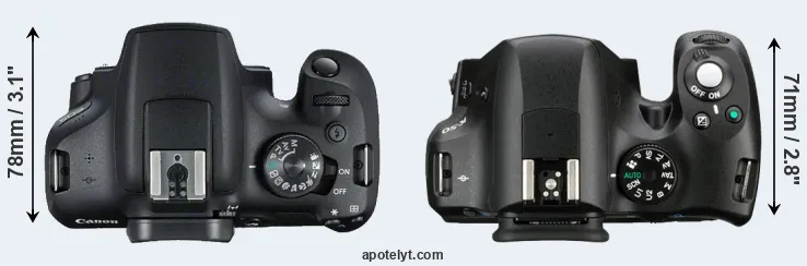 The side-by-side display below illustrates the physical size and weight of the Canon 2000D and the Pentax K-50. The two cameras are presented according to their relative size. Three consecutive views from the front, the top, and the rear side are shown. All size dimensions are rounded to the nearest millimeter.