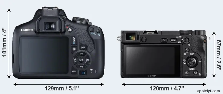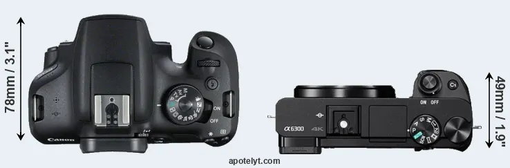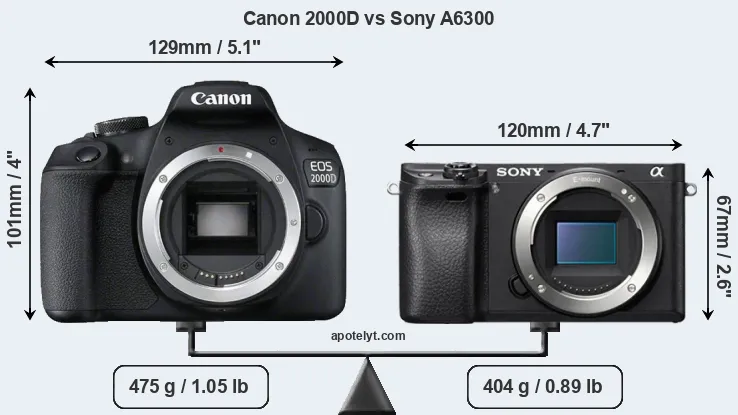 The side-by-side display below illustrates the physical size and weight of the Canon 2000D and the Sony A6300. The two cameras are presented according to their relative size. Three consecutive perspectives from the front, the top, and the back are available. All width, height and depth measures are rounded to the nearest millimeter.