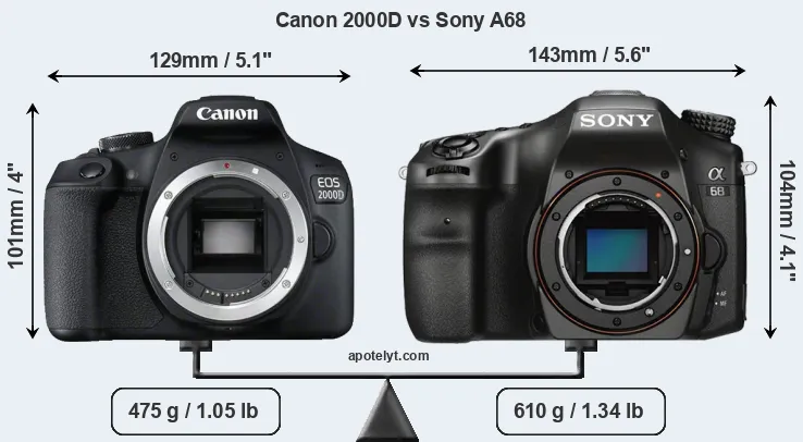 The side-by-side display below illustrates the physical size and weight of the Canon 2000D and the Sony A68. The two cameras are presented according to their relative size. Three successive views from the front, the top, and the rear are shown. All width, height and depth dimensions are rounded to the nearest millimeter.