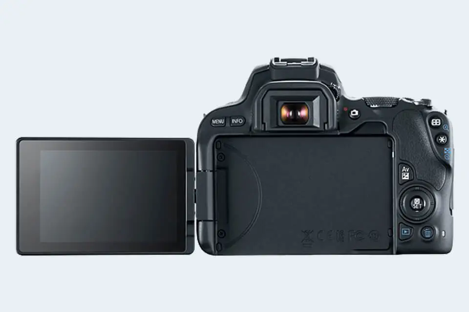 The LCD screen on the Canon EOS 200D is flexibly attached to the body. In particular, the LCD is hinged on the side and can be flipped out for odd-angle shots in both portrait and landscape orientation. Also, this fully articulated, swivel type of LCD attachment is often appreciated by videographers for its flexibility. Moreover, v-loggers like the design because the screen can be turned to be front-facing.