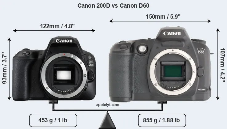 The side-by-side display below illustrates the physical size and weight of the Canon 200D and the Canon D60. The two cameras are presented according to their relative size. Three successive views from the front, the top, and the rear are shown. All width, height and depth measures are rounded to the nearest millimeter.