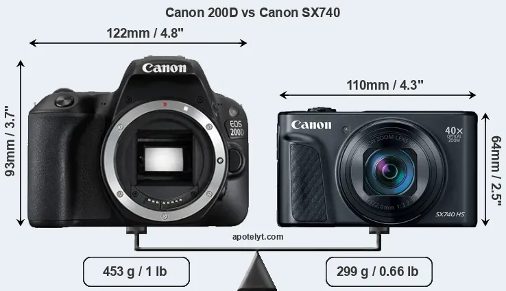 An illustration of the physical size and weight of the Canon 200D and the Canon SX740 is provided in the side-by-side display below. The two cameras are presented according to their relative size. Three successive views from the front, the top, and the rear are shown. All width, height and depth dimensions are rounded to the nearest millimeter.