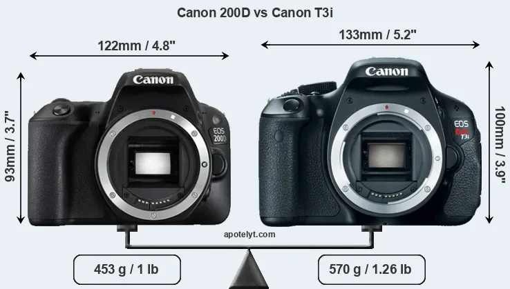 The side-by-side display below illustrates the physical size and weight of the Canon 200D and the Canon T3i. The two cameras are presented according to their relative size. Three consecutive views from the front, the top, and the rear side are shown. All width, height and depth dimensions are rounded to the nearest millimeter.
