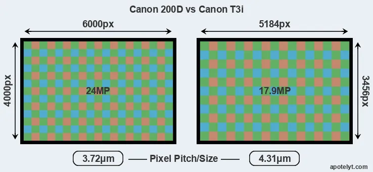 While the two cameras under review share the same sensor size, the 200D offers a higher resolution of 24 megapixels, compared with 17.9 MP of the T3i. This megapixels advantage translates into a 16 percent gain in linear resolution. On the other hand, these sensor specs imply that the 200D has a higher pixel density and a smaller size of the individual pixel (with a pixel pitch of 3.72μm versus 4.31μm for the T3i). In this context, it should be noted, however, that the 200D is much more recent (by 6 years and 4 months) than the T3i, and its sensor will have benefitted from technological advances during this time that compensate for the smaller pixel size.