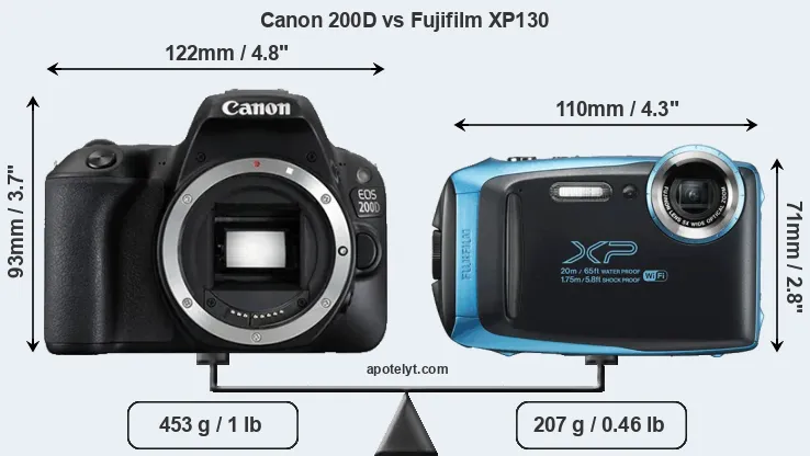 The side-by-side display below illustrates the physical size and weight of the Canon 200D and the Fujifilm XP130. The two cameras are presented according to their relative size. Three consecutive views from the front, the top, and the rear side are shown. All width, height and depth dimensions are rounded to the nearest millimeter.