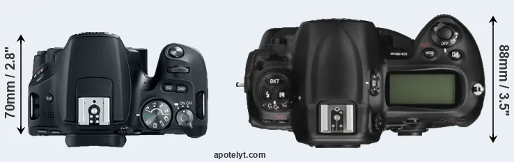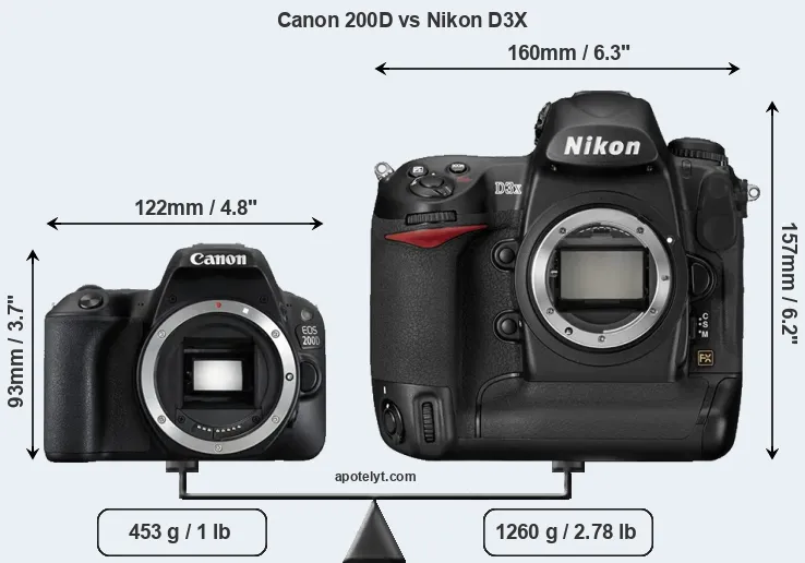 The physical size and weight of the Canon 200D and the Nikon D3X are illustrated in the side-by-side display below. The two cameras are presented according to their relative size. Three consecutive perspectives from the front, the top, and the back are available. All width, height and depth measures are rounded to the nearest millimeter.