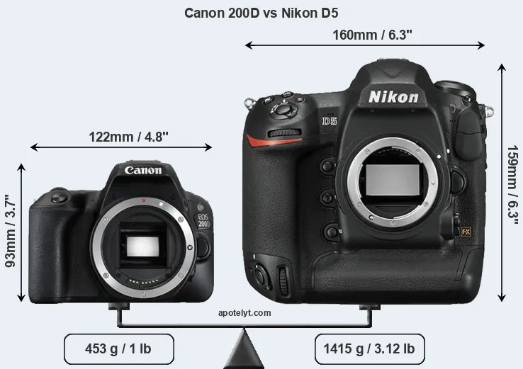 The side-by-side display below illustrates the physical size and weight of the Canon 200D and the Nikon D5. The two cameras are presented according to their relative size. Three successive views from the front, the top, and the rear are shown. All width, height and depth measures are rounded to the nearest millimeter.
