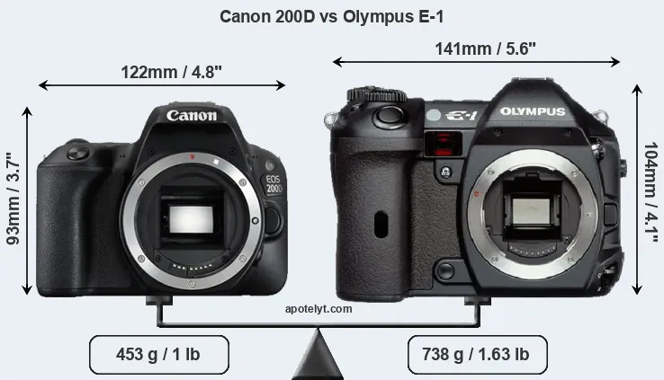 If the front view area (width x height) of the cameras is taken as an aggregate measure of their size, the Olympus E-1 is notably larger (29 percent) than the Canon 200D. Moreover, the E-1 is substantially heavier (63 percent) than the 200D. It is noteworthy in this context that the E-1 is splash and dust-proof, while the 200D does not feature any corresponding weather-sealing.