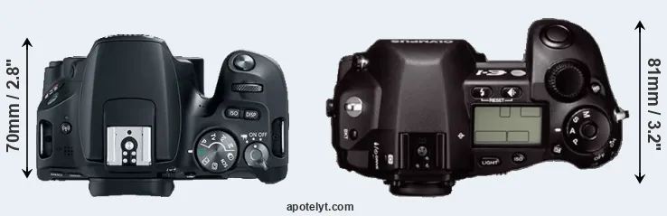 The side-by-side display below illustrates the physical size and weight of the Canon 200D and the Olympus E-1. The two cameras are presented according to their relative size. Three consecutive perspectives from the front, the top, and the back are available. All width, height and depth dimensions are rounded to the nearest millimeter.