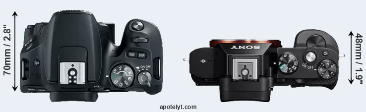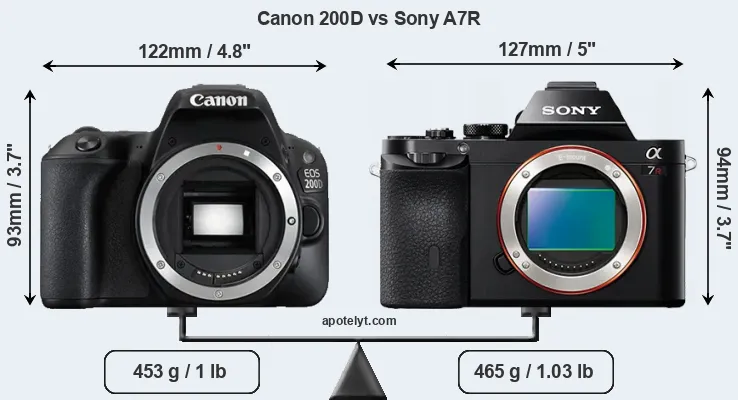 The physical size and weight of the Canon 200D and the Sony A7R are illustrated in the side-by-side display below. The two cameras are presented according to their relative size. Three successive views from the front, the top, and the rear are shown. All width, height and depth dimensions are rounded to the nearest millimeter.