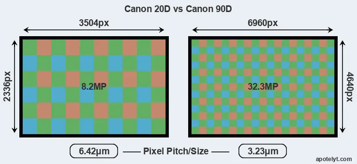 While the two cameras under review share the same sensor size, the 90D offers a higher resolution of 32.3 megapixels, compared with 8.2 MP of the 20D. This megapixels advantage translates into a 99 percent gain in linear resolution. On the other hand, these sensor specs imply that the 90D has a higher pixel density and a smaller size of the individual pixel (with a pixel pitch of 3.23μm versus 6.42μm for the 20D). However, it should be noted that the 90D is much more recent (by 15 years) than the 20D, and its sensor will have benefitted from technological advances during this time that compensate for the smaller pixel size.