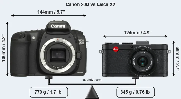 An illustration of the physical size and weight of the Canon 20D and the Leica X2 is provided in the side-by-side display below. The two cameras are presented according to their relative size. Three consecutive perspectives from the front, the top, and the back are available. All size dimensions are rounded to the nearest millimeter.