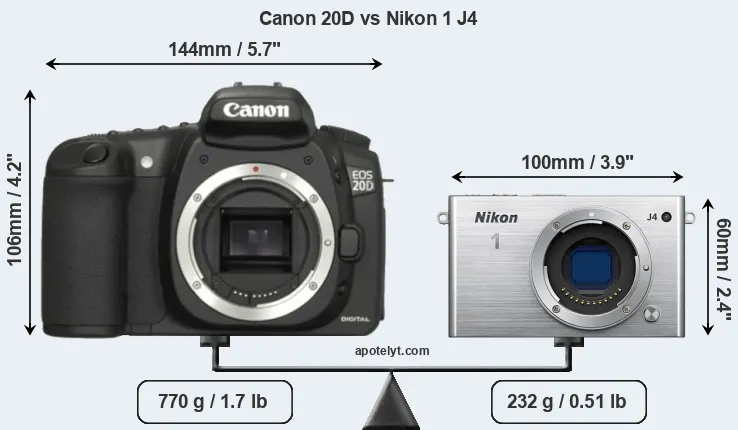 The side-by-side display below illustrates the physical size and weight of the Canon 20D and the Nikon 1 J4. The two cameras are presented according to their relative size. Three consecutive views from the front, the top, and the rear side are shown. All width, height and depth dimensions are rounded to the nearest millimeter.