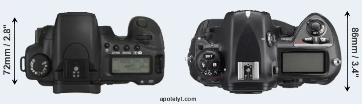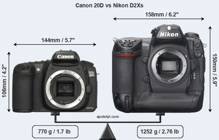 The side-by-side display below illustrates the physical size and weight of the Canon 20D and the Nikon D2Xs. The two cameras are presented according to their relative size. Three successive views from the front, the top, and the rear are shown. All width, height and depth measures are rounded to the nearest millimeter.