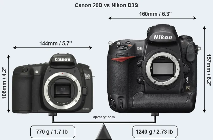 The physical size and weight of the Canon 20D and the Nikon D3S are illustrated in the side-by-side display below. The two cameras are presented according to their relative size. Three consecutive perspectives from the front, the top, and the back are available. All width, height and depth dimensions are rounded to the nearest millimeter.