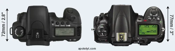 The side-by-side display below illustrates the physical size and weight of the Canon 20D and the Nikon D700. The two cameras are presented according to their relative size. Three consecutive perspectives from the front, the top, and the back are available. All width, height and depth measures are rounded to the nearest millimeter.