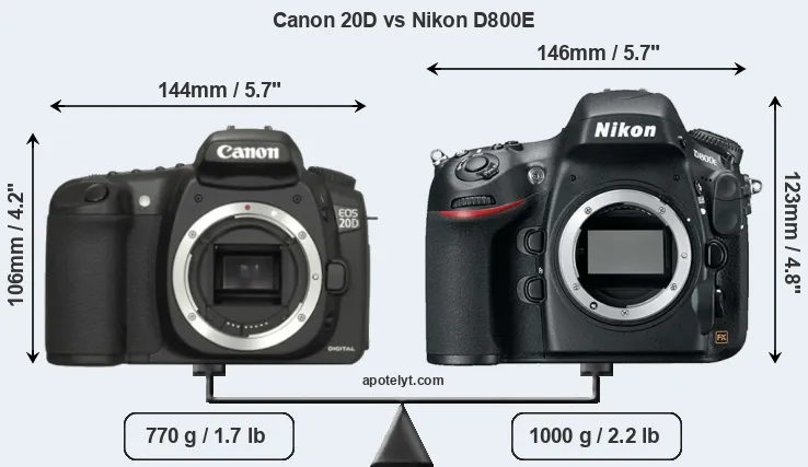 If the front view area (width x height) of the cameras is taken as an aggregate measure of their size, the Nikon D800E is notably larger (18 percent) than the Canon 20D. Moreover, the D800E is markedly heavier (30 percent) than the 20D. It is noteworthy in this context that the D800E is splash and dust-proof, while the 20D does not feature any corresponding weather-sealing.