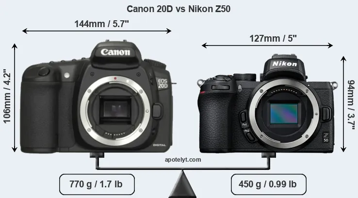 If the front view area (width x height) of the cameras is taken as an aggregate measure of their size, the Nikon Z50 is notably smaller (22 percent) than the Canon 20D. Moreover, the Z50 is substantially lighter (42 percent) than the 20D. It is noteworthy in this context that the Z50 is splash and dust-proof, while the 20D does not feature any corresponding weather-sealing.