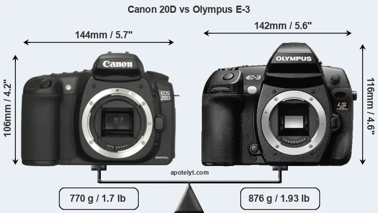 An illustration of the physical size and weight of the Canon 20D and the Olympus E-3 is provided in the side-by-side display below. The two cameras are presented according to their relative size. Three consecutive perspectives from the front, the top, and the back are available. All width, height and depth measures are rounded to the nearest millimeter.