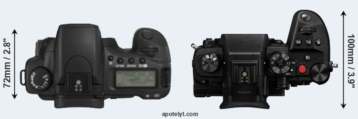 The side-by-side display below illustrates the physical size and weight of the Canon 20D and the Panasonic GH6. The two cameras are presented according to their relative size. Three consecutive views from the front, the top, and the rear side are shown. All size dimensions are rounded to the nearest millimeter.