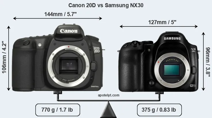 An illustration of the physical size and weight of the Canon 20D and the Samsung NX30 is provided in the side-by-side display below. The two cameras are presented according to their relative size. Three consecutive perspectives from the front, the top, and the back are available. All width, height and depth dimensions are rounded to the nearest millimeter.