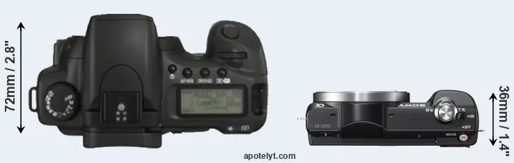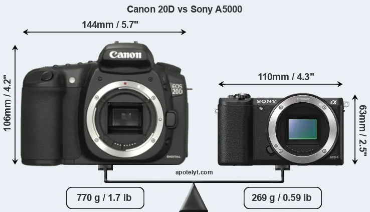 The side-by-side display below illustrates the physical size and weight of the Canon 20D and the Sony A5000. The two cameras are presented according to their relative size. Three consecutive perspectives from the front, the top, and the back are available. All width, height and depth measures are rounded to the nearest millimeter.