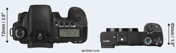 The physical size and weight of the Canon 20D and the Sony A6000 are illustrated in the side-by-side display below. The two cameras are presented according to their relative size. Three consecutive views from the front, the top, and the rear side are shown. All width, height and depth dimensions are rounded to the nearest millimeter.