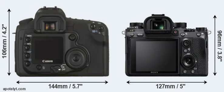 The side-by-side display below illustrates the physical size and weight of the Canon 20D and the Sony A9. The two cameras are presented according to their relative size. Three successive views from the front, the top, and the rear are shown. All size dimensions are rounded to the nearest millimeter.