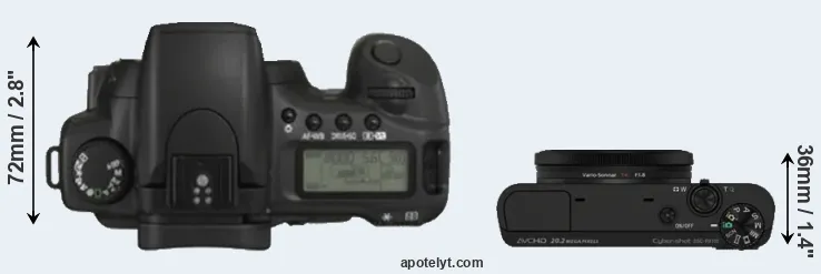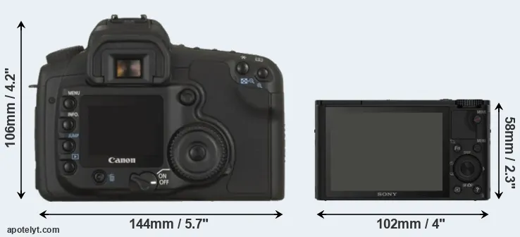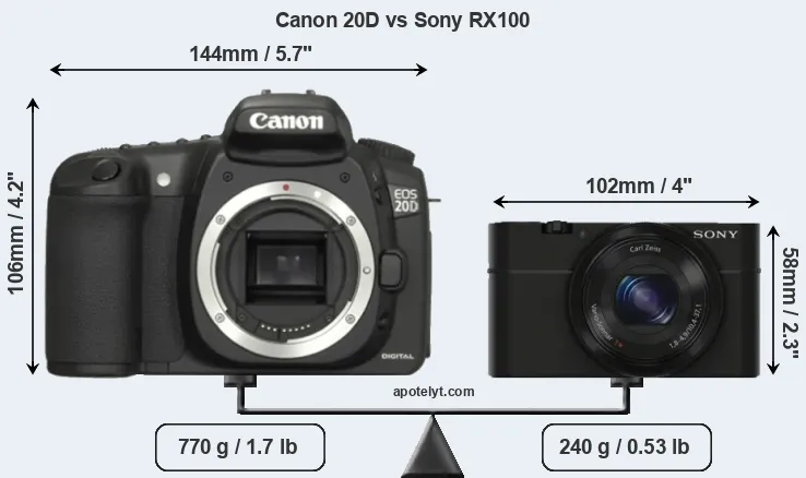 The above size and weight comparisons are to some extent incomplete and possibly misleading, as the RX100 has a lens built in, whereas the 20D is an interchangeable lens camera that requires a separate lens. Attaching the latter will add extra weight and bulk to the setup. You can compare the optics available for the 20D and their specifications in the Canon EF Lens Catalog.