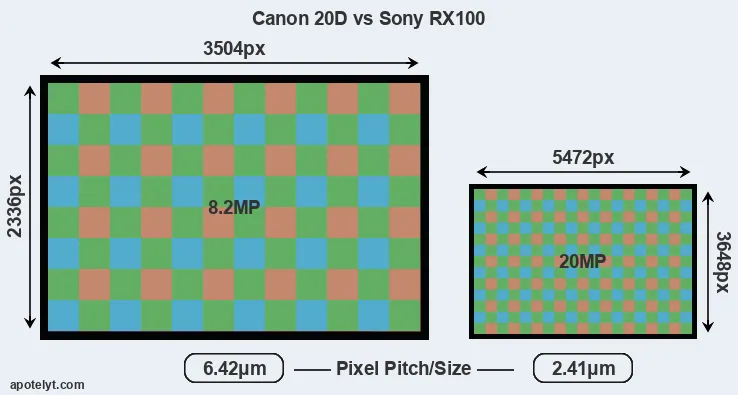 Despite having a smaller sensor, the RX100 offers a higher resolution of 20 megapixels, compared with 8.2 MP of the 20D. This megapixels advantage comes at the cost of a higher pixel density and a smaller size of the individual pixel (with a pixel pitch of 2.41μm versus 6.42μm for the 20D). However, it should be noted that the RX100 is much more recent (by 7 years and 9 months) than the 20D, and its sensor will have benefitted from technological advances during this time that make it possible to gather light more efficiently.