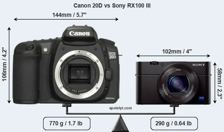 The above size and weight comparisons are to some extent incomplete and possibly misleading, as the RX100 III has a lens built in, whereas the 20D is an interchangeable lens camera that requires a separate lens. Attaching the latter will add extra weight and bulk to the setup. You can compare the optics available for the 20D and their specifications in the Canon EF Lens Catalog.