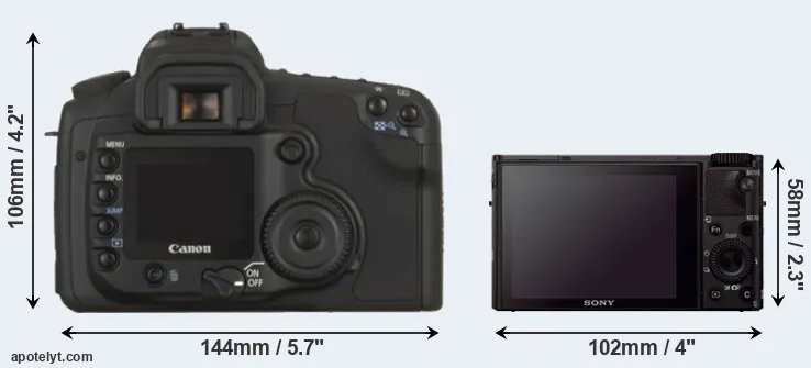 The physical size and weight of the Canon 20D and the Sony RX100 III are illustrated in the side-by-side display below. The two cameras are presented according to their relative size. Three consecutive perspectives from the front, the top, and the back are available. All size dimensions are rounded to the nearest millimeter.