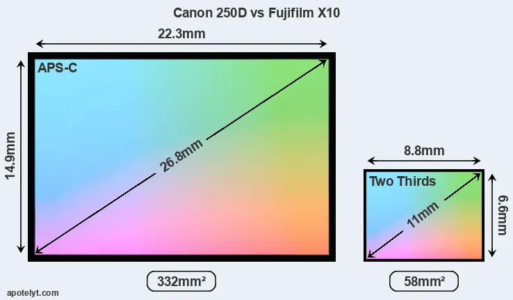 Of the two cameras under consideration, the Canon 250D features an APS-C sensor and the Fujifilm X10 a 2/3 sensor. The sensor area in the X10 is 83 percent smaller. As a result of these sensor size differences, the cameras have a format factor of, respectively, 1.6 and 3.9. The sensor in the 250D has a native 3:2 aspect ratio, while the one in the X10 offers a 4:3 aspect.