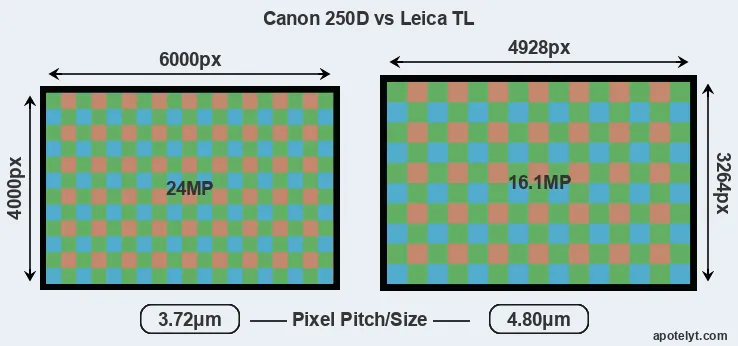 Despite having a smaller sensor, the Canon 250D offers a higher resolution of 24 megapixels, compared with 16.1 MP of the Leica TL. This megapixels advantage comes at the cost of a higher pixel density and a smaller size of the individual pixel (with a pixel pitch of 3.72μm versus 4.80μm for the TL). However, it should be noted that the 250D is much more recent (by 2 years and 5 months) than the TL, and its sensor will have benefitted from technological advances during this time that make it possible to gather light more efficiently. Coming back to sensor resolution, it should be mentioned that the TL has no anti-alias filter installed, so that it can capture all the detail its sensor resolves.