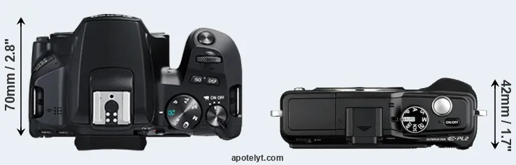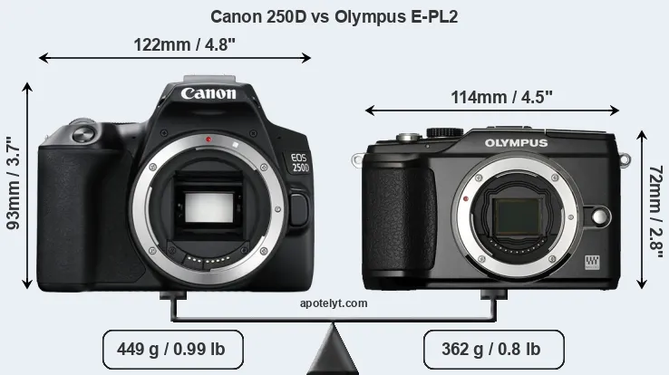 The side-by-side display below illustrates the physical size and weight of the Canon 250D and the Olympus E-PL2. The two cameras are presented according to their relative size. Three successive views from the front, the top, and the rear are shown. All width, height and depth dimensions are rounded to the nearest millimeter.