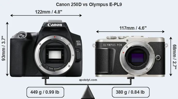The physical size and weight of the Canon 250D and the Olympus E-PL9 are illustrated in the side-by-side display below. The two cameras are presented according to their relative size. Three successive views from the front, the top, and the rear are shown. All width, height and depth dimensions are rounded to the nearest millimeter.
