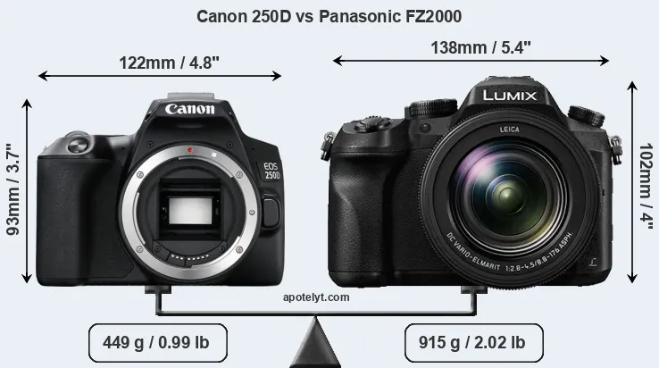 The physical size and weight of the Canon 250D and the Panasonic FZ2000 are illustrated in the side-by-side display below. The two cameras are presented according to their relative size. Three consecutive perspectives from the front, the top, and the back are available. All width, height and depth dimensions are rounded to the nearest millimeter.